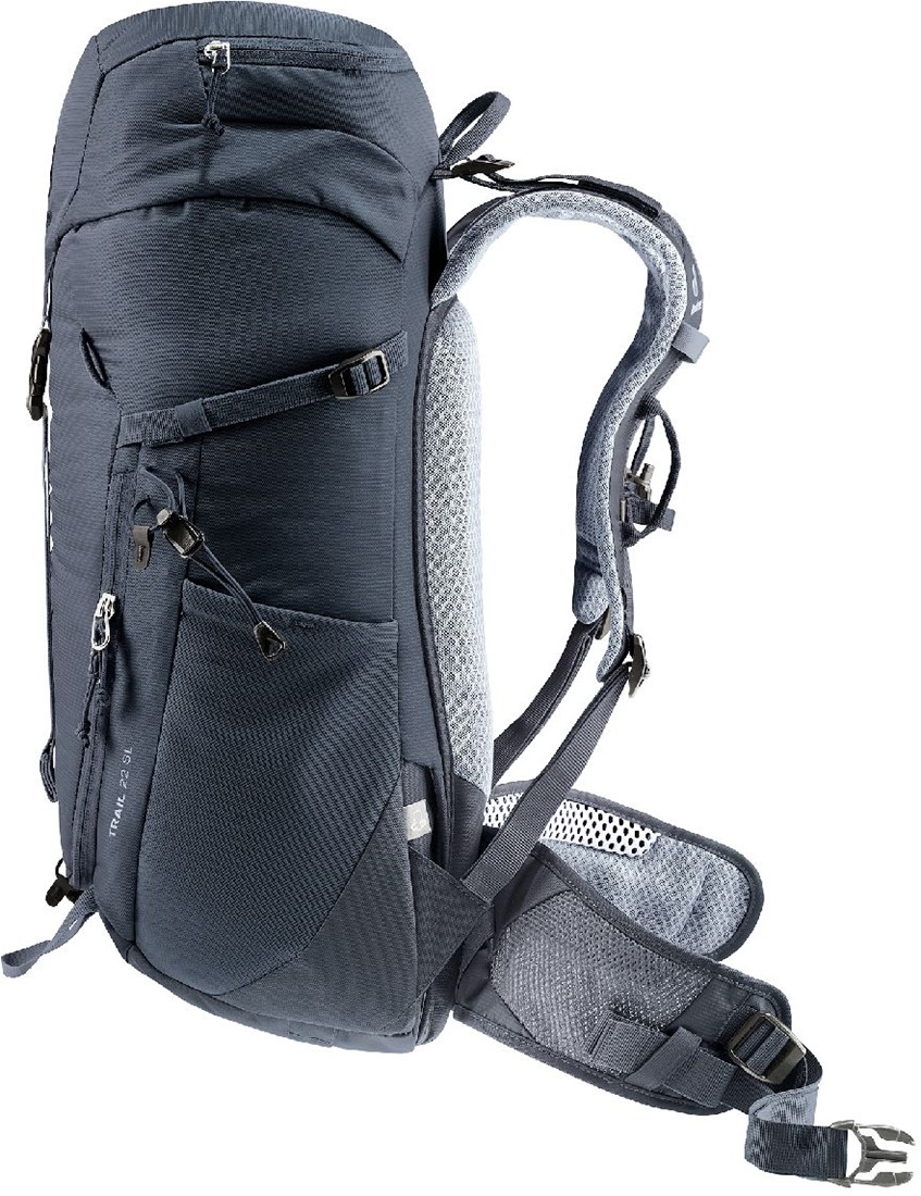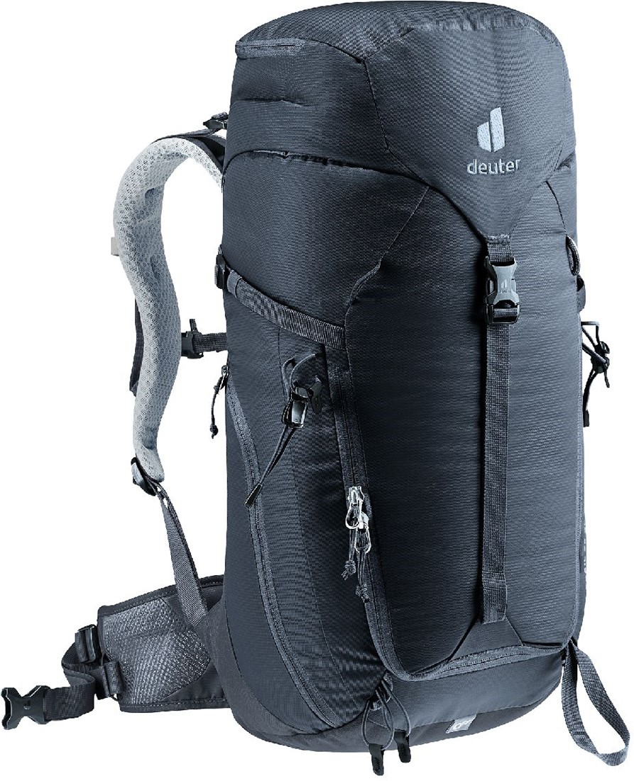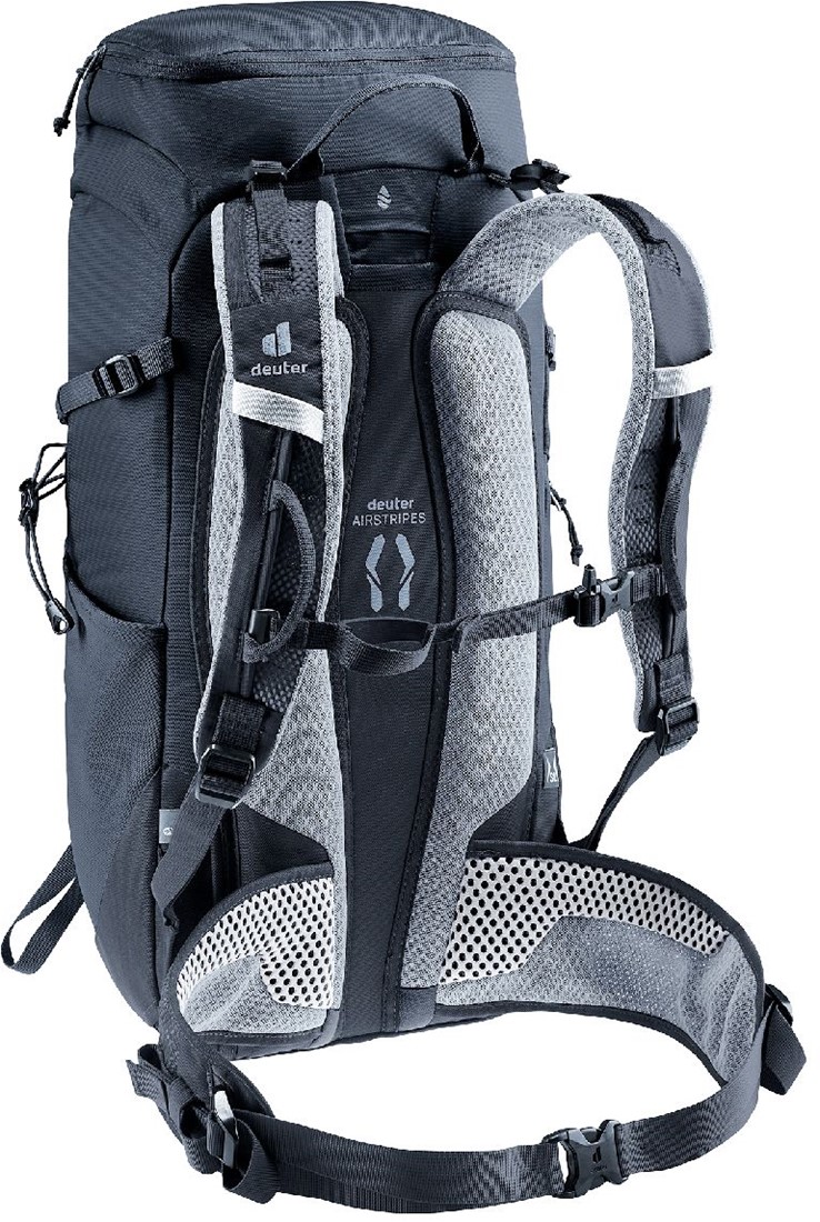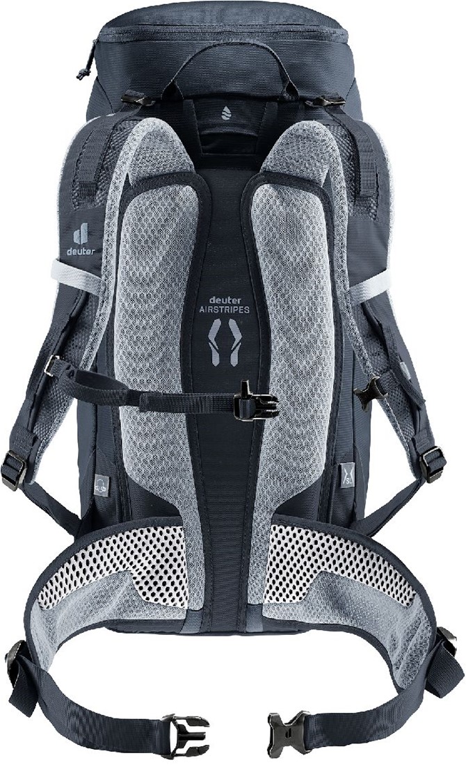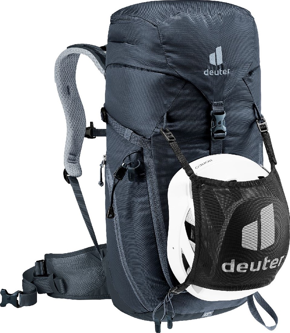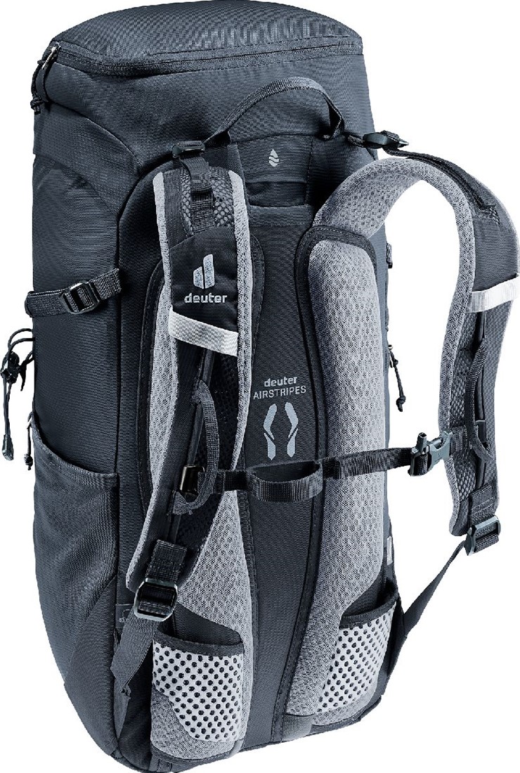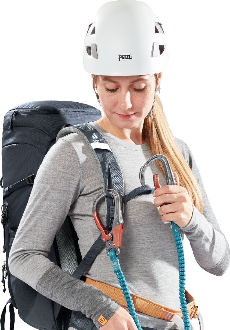 The reduced contact surface and large ventilation channels of the deuter Airstripes back system combined with perforated shoulder straps and hip fins ensure maximum airflow and even weight distribution - for a snug, secure fit over any terrain. A flat-format lid allows space for the head to move, even when wearing a helmet. Loops on the shoulder straps keep via ferrata set carabiners close at hand. And thanks to a large front zipper opening and side pockets, equipment is always easy to access.